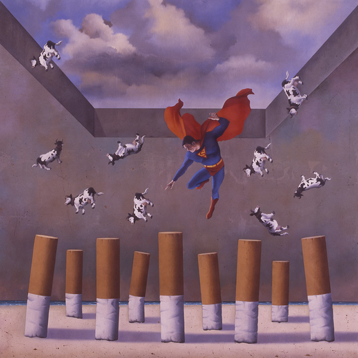 Utilizamos la palabra cielo tanto para designar la atmósfera de la tierra como la mansión donde los Ángeles, los santos y los aventurados gozan de la presencia de Dios. El primero está sucio, cargado, y del segundo, luminoso y esperanzador se descuelgan sobre una playa: las vacas de la abundancia, un héroe de ficción con poderes sobrenaturales y los cigarros de mí amada Helena. Nada encaja. Son imágenes contradictorias, sin conexión aparente, como esos pensamientos que en ocasiones produce el cerebro sin darnos las claves para descifrarlos.