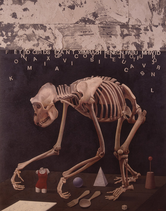 Este esqueleto se encuentra en el Museo Nacional de Ciencias Naturales de Madrid y es un antecesor del hombre. El esqueleto personifica la muerte. No representa una muerte estática, un estado definitivo sino una muerte dinámica, anunciadora e instrumento de una nueva forma de vida. Sexualidad, alimentos, integración y convergencia, conocimiento, cultura, todo nos sirve para la vida. Con todo elaboramos el gran antídoto que nos hace olvidar la muerte. Celebramos la alegría de estar vivos con creaciones que nos alejan de la muerte, ¿que es si no el arte? El hombre es el único ser vivo que sabe que va a morir. Las religiones nos ofertan una vida posterior y pareciera que este ofrecimiento esconde la duda de que no nos puede ir bien en esta. La inteligencia hace guiños con el humor y nos convierte en el mono triunfante.