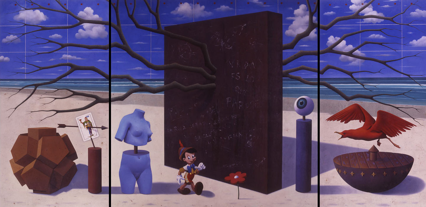 Todo es mentira o tal vez no. La realidad la construye el ojo que observa. Hay por lo tanto millones de realidades, tantas como la multitud de los granos de arena de esta playa. La realidad se observa desde diferentes percepciones. El ojo es la percepción intelectual. El pájaro la percepción espiritual. Venus la carnal. Pinocho es la mentira inocente. El monolito la unidad frente a la multiplicidad. Las ramas representan la flexibilidad y la regeneración. Lo lúdico se pega a la carta que es penetrada por la flecha, símbolo de la celeridad de la intuición. El poliedro en un extremo y en el otro la media esfera representan la idea de lo perfecto, de lo cerrado y estructurado, cada uno desde su esencia.