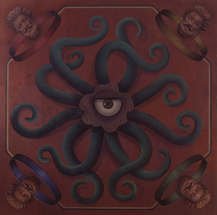 Los ojos heterotópicos, es decir, desplazados de su lugar anatómico, aluden a la clarividencia. Si el ojo es único y frontal simboliza la omnipresencia, la imposibilidad de estar fuera de su alcance. Debajo de la espiral yace una serpiente, emblema de la sabiduría y de la eternidad. Platón dice de la cabeza humana que representa la imagen del mundo. Los anillos simbolizan las cuatro estaciones del hombre. La abertura del ojo es un rito de iniciación al conocimiento.